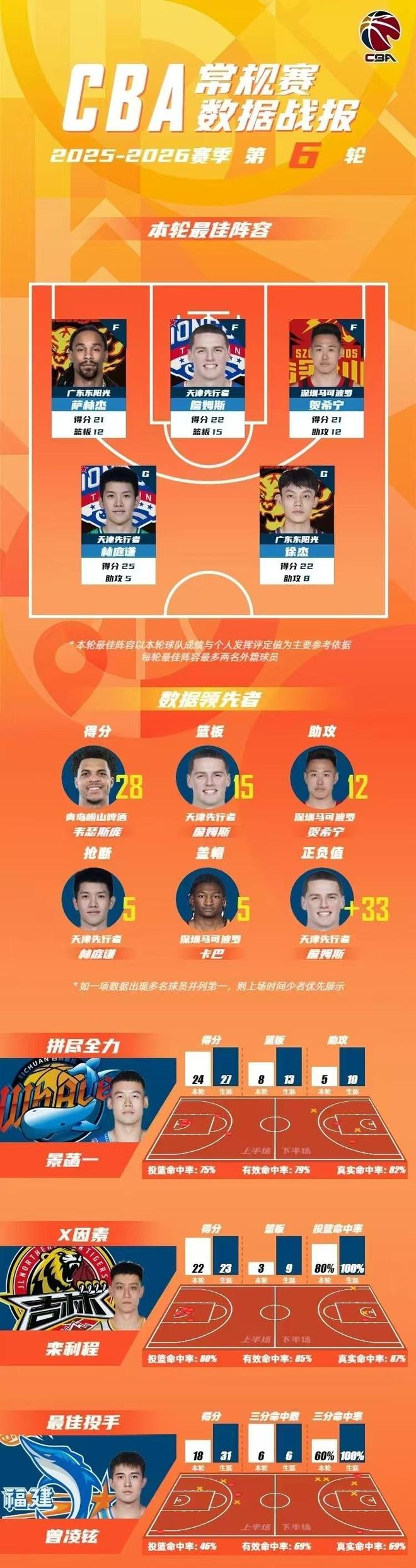 CBA官宣常规赛第6轮最佳阵容,广东双核萨林杰21+12与徐杰22+5+8+5三分携手入选,天津双核詹姆斯22+15与林庭谦25+4+5+5携手入选,深圳本土核心贺希宁21+8+12连续两轮入选。
